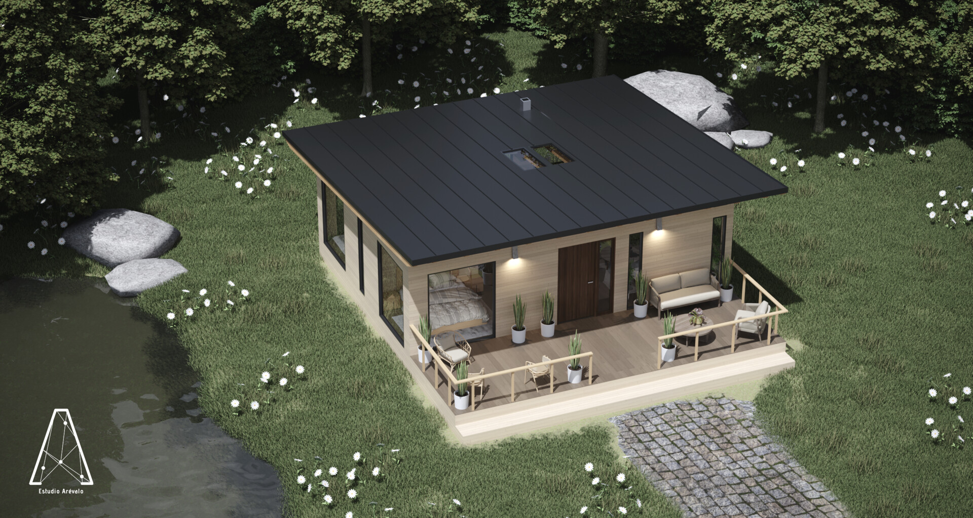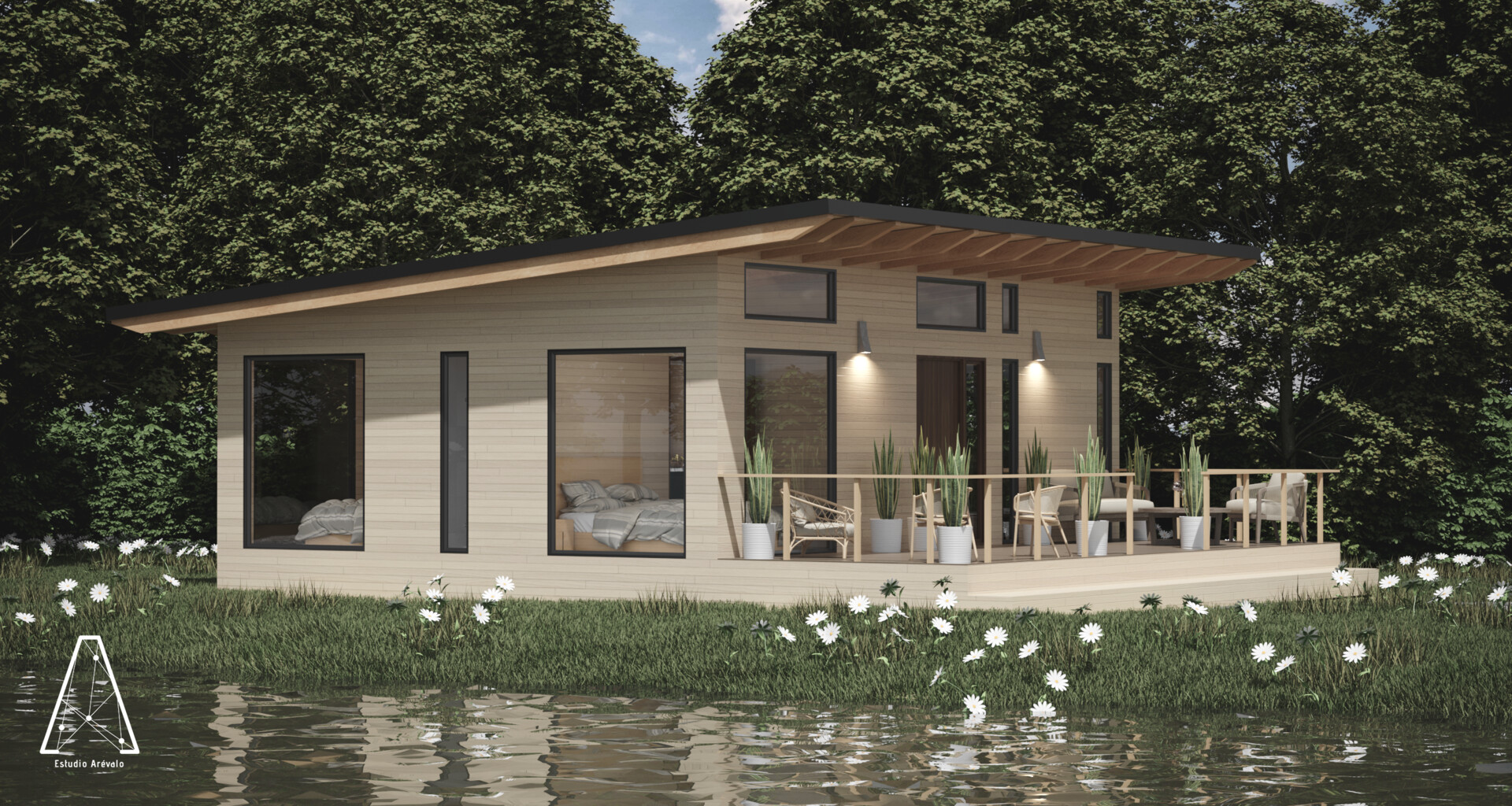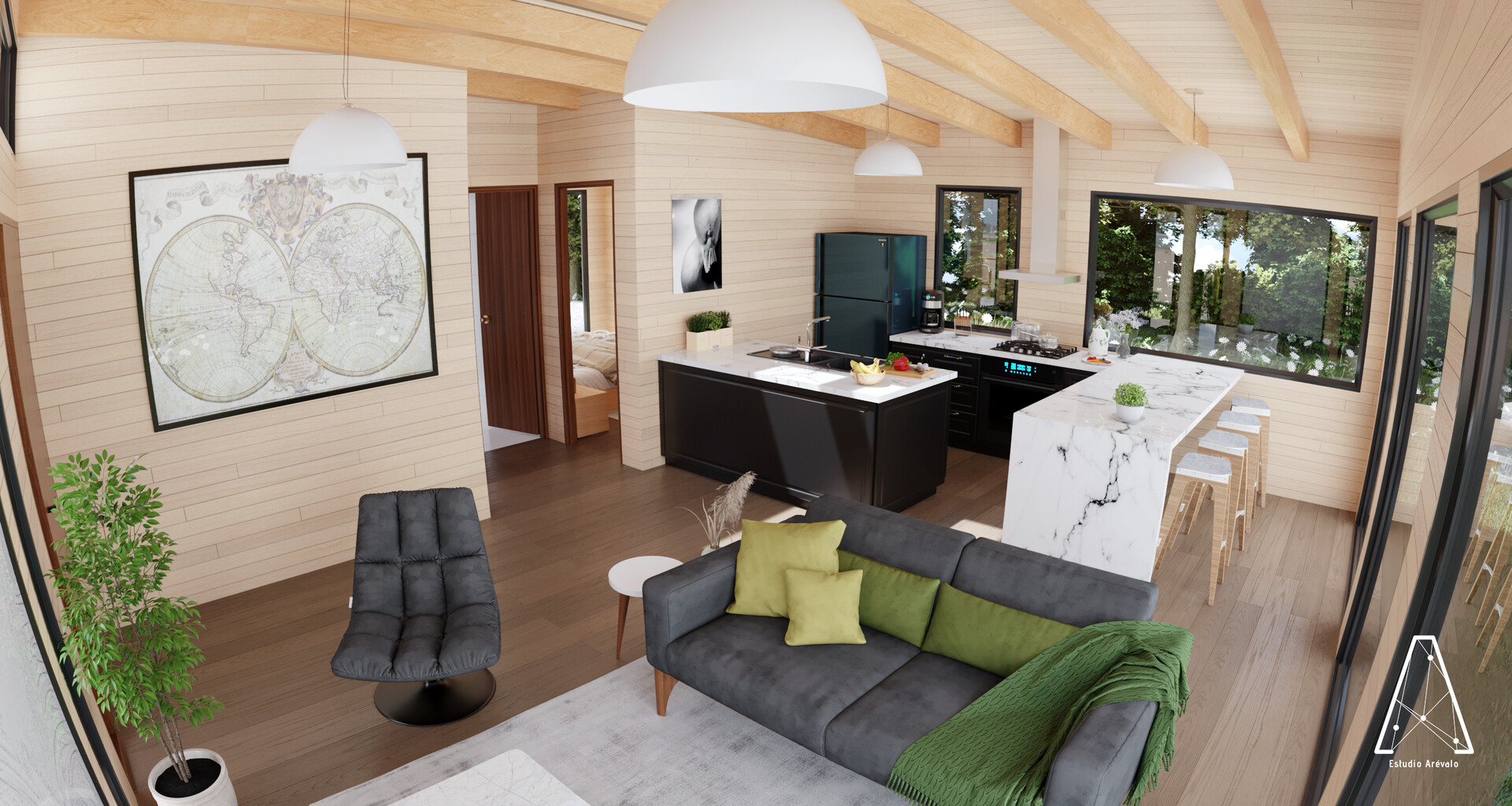Proyecto de diseño arquitectónico de cabaña en madera, concebida para integrarse al entorno natural y potenciar las vistas hacia la vegetación circundante