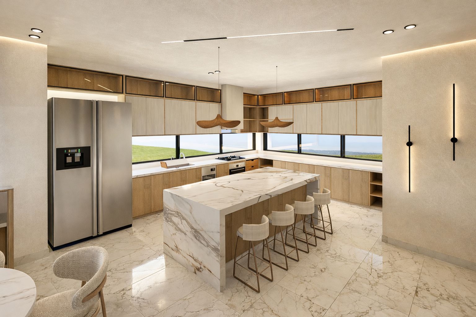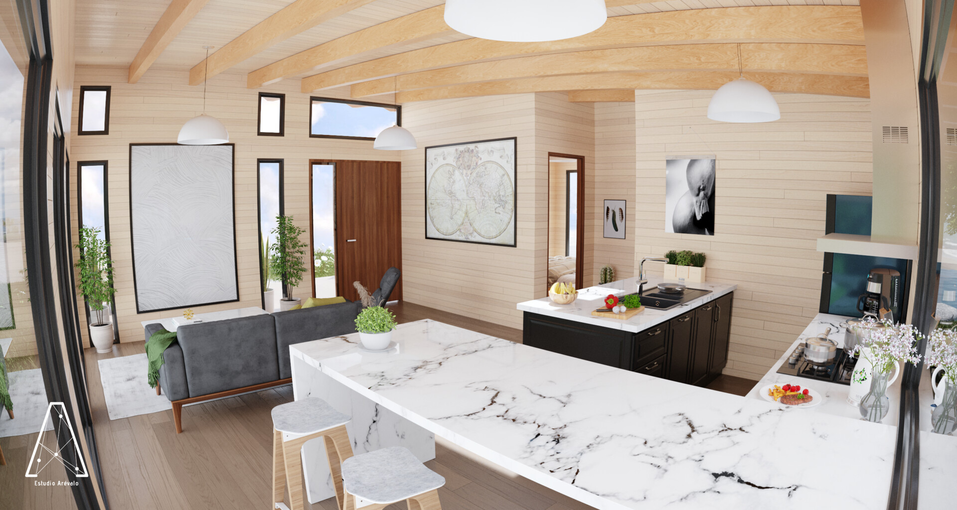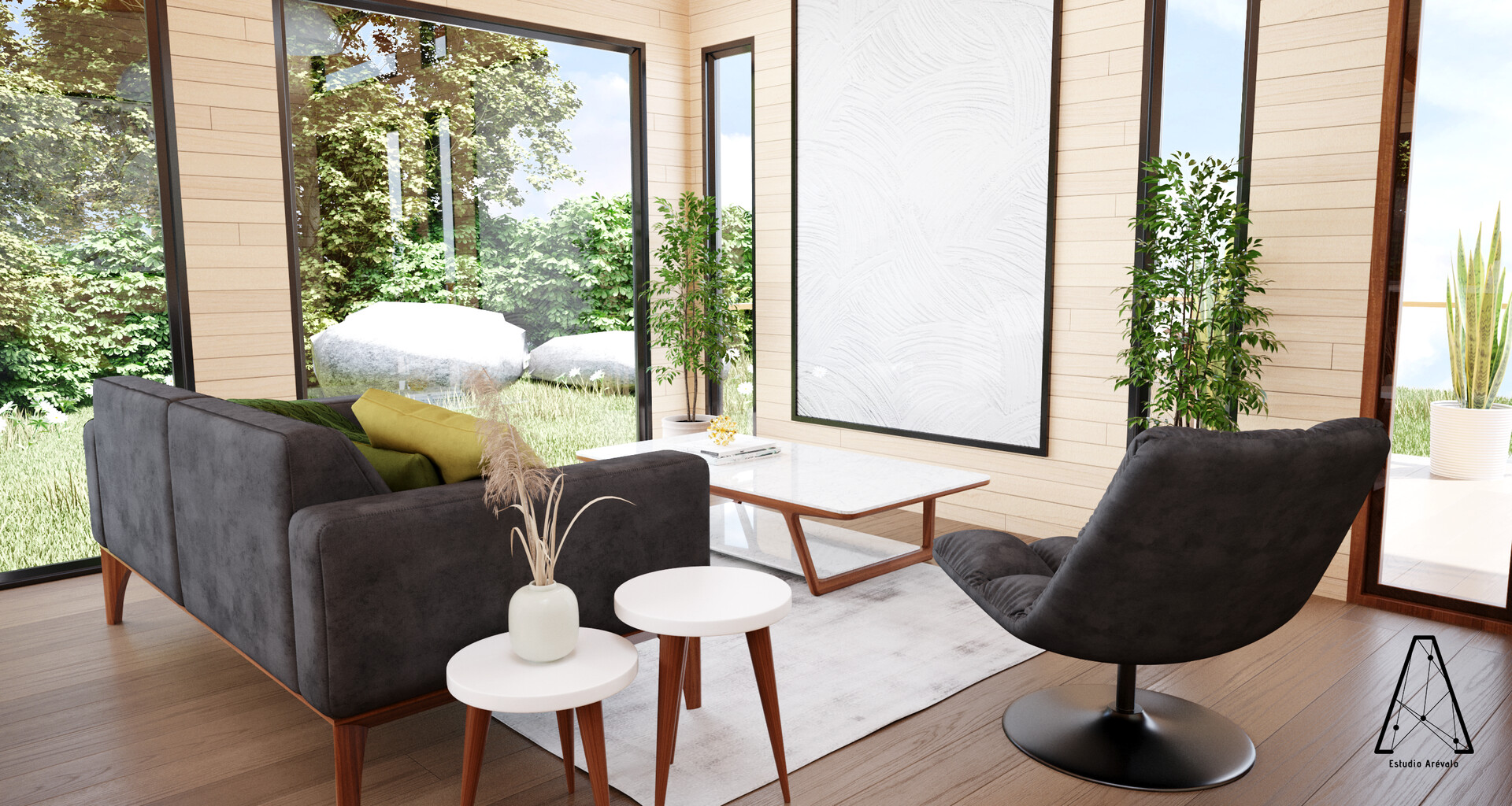 Proyecto de diseño arquitectónico de cabaña en madera, concebida para integrarse al entorno natural y potenciar las vistas hacia la vegetación circundante